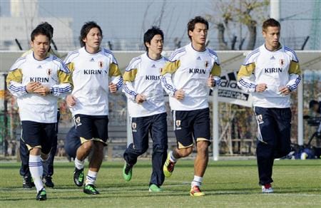 サッカーのアジア杯に向け、練習を開始した日本代表。右から本田圭、槙野、香川、(1人おいて)長友=大阪府内
