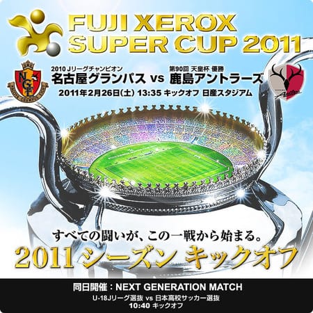 14日、Jリーグは今月26日に日産スタジアムでリーグ王者の名古屋と天皇杯王者の鹿島が激突する「FUJI XEROX SUPER CUP 2011」のS席(ホーム側)、SA席、B席、G席が完売したと発表した。