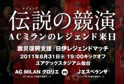 このたび、震災復興支援 日伊レジェンドマッチ実行委員会と社団法人宮城県サッカー協会は、震災の被害にあわれましたサッカーファミリーのみなさんの復興を支援するため、チャリティーマッチ「震災復興支援 日伊レジェンドマッチ/AC MILAN グロリエ VS Jエスペランサ」を、仙台にて開催することにいたしました。