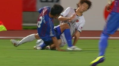 ただ、甲府の選手がスライディングし損ねて、軸足が立った状態のまま、滑らず尻餅つくような体勢でブロックする形になってしまった