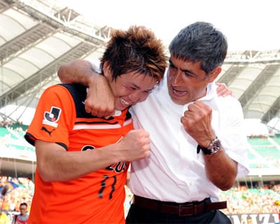この日の殊勲者・大前元紀(写真左)は試合後、ゴトビ監督から熱い祝福を受けた。 以下、清水スレより