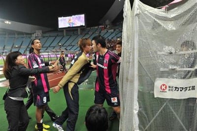 挨拶時、メインスタンドの客がペットボトルをグランドに投げ入れる→モニに当たりそうになる→側を歩いてた扇原が怒ってそのペットボトルをスタンドに投げ返す→それが関係ない客に当たりそうになりその客が怒る→モニに連れられ、扇原謝罪。 呆れた