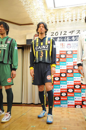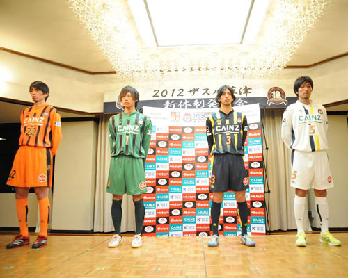 21日、前橋市内でザスパ草津の新体制発表会が行われた。植木代表(兼GM)らがスポンサーに今季の目標や将来のヴィジョンを述べたのち2012シーズンのユニフォーム発表が行われた。左からGK北一真、GK内藤圭佑、DF御厨貴文主将、DF中村英之副主将。