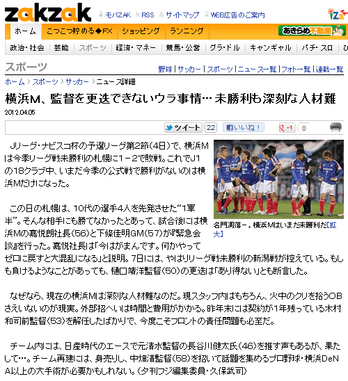 [ZAKZAK]横浜M、監督を更迭できないウラ事情…未勝利も深刻な人材難