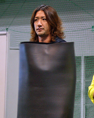 こちらは弾丸シュートを打つためのヒントを体を張って実演するゲストの平瀬智行さん。