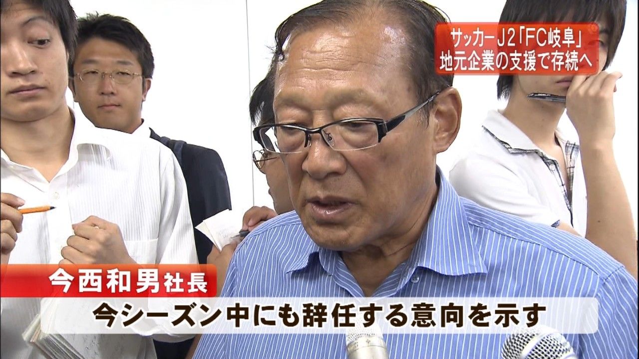 経営難が深刻化し、Jリーグから来年度のリーグ加盟が難しいとの見通しが示されているサッカーJ2・FC岐阜の今西和男社長が23日、引責辞任することを明らかにした。この日、FC岐阜を支援する岐阜県や岐阜市、県経済界のトップらが再建策を協議し、必要な資金1億5千万円を集めるめどが立ったことが報告された。