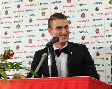 名古屋に移籍新加入したヤキモフスキ―選手。まさかの蝶ネクタイで登場し、