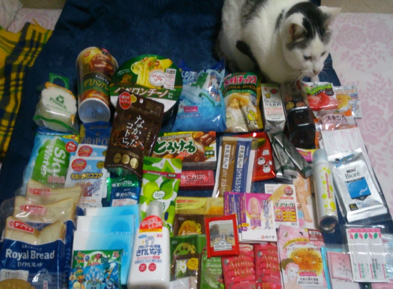 ヤックスマッチデーの戦利品を帰宅したので広げてみた。これで二人分。これは来年もあったらまたがんばるんばwカップラーメン一個とかサンプルの限度を超えてる気がww twitpic.com/curtnw