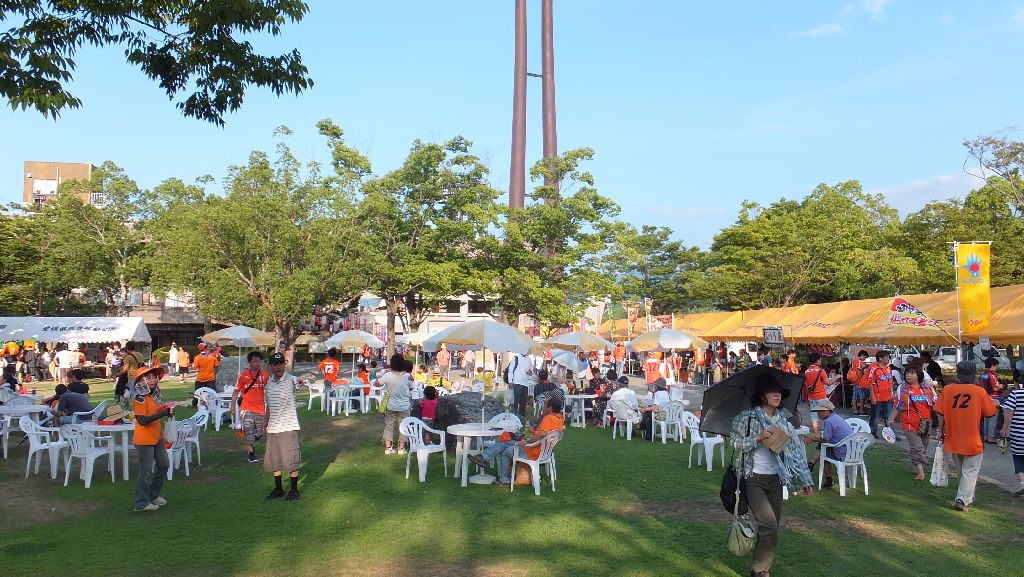 浴衣デーということで、浴衣姿の石井と赤井がサポーターと記念撮影