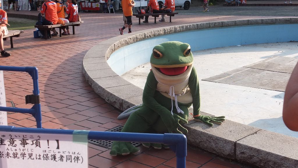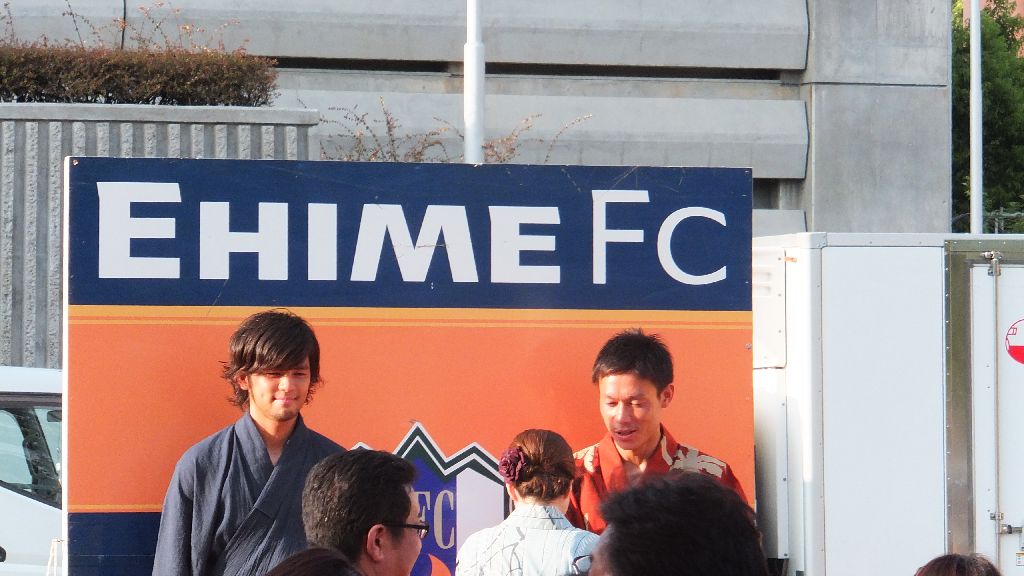 試合後、外国人選手(アライール?)の家族がたま媛ちゃんと記念撮影してました