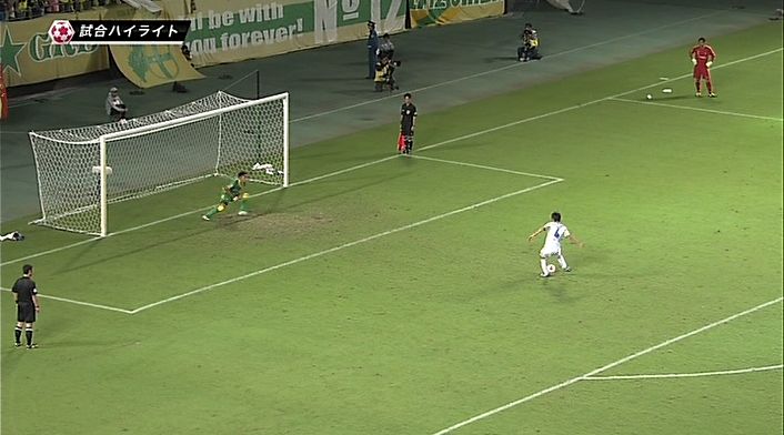 ※助走でフェイントかけるもGK岡本が動かず、ただの助走無しキックに→止められる