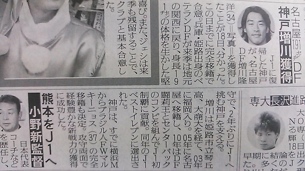 [報知]【神戸】名古屋の191センチDF増川を獲得