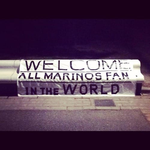 横断幕のメッセージは「WELCOME ALL MARINOS FAN IN THE WORLD」。