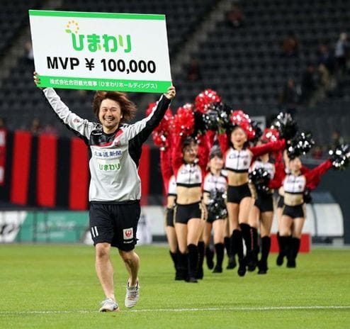 この試合で決勝ゴールを挙げた札幌FW前田俊介はMVPに輝き、ゲームスポンサーのひまわりホールディングスから賞金10万円をゲットしましたが、その様子を収めた日刊スポーツの写真の構図があまりにも完璧すぎると話題になっていました。
