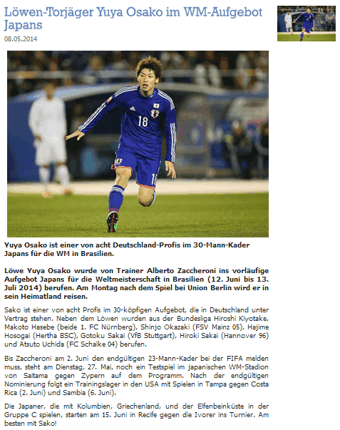 掲載記事では大迫のほか、MF長谷部誠、MF清武弘嗣(ともにニュルンベルク)、FW岡崎慎司(マインツ)、MF細貝萌(ヘルタ)、DF酒井高徳(シュツットガルト)、DF酒井宏樹(ハノーバー)、DF内田篤人(シャルケ)を合わせ、計8人のドイツ組が選ばれたことを伝えている。MF乾貴士(フランクフルト)の名前はなかった。