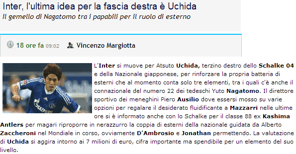 同メディアは、インテルがサイドプレーヤーの戦力強化のため、内田に興味を示していると報道。サイドをこなす戦力が、長友とDFジョナタン、DFダニーロ・ダンブロジオの3選手しかいないことに言及した。