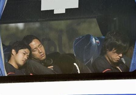 お疲れな様子の遠藤と、寄り添って寝てる内田&麻也。