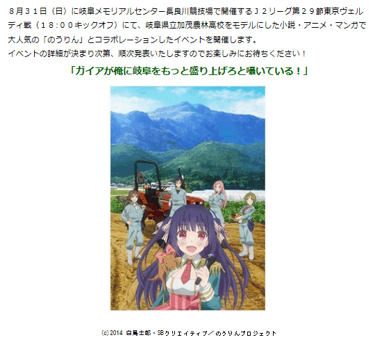 FC岐阜は4日、アニメ「のうりん」とのコラボイベントの実施を発表しました。