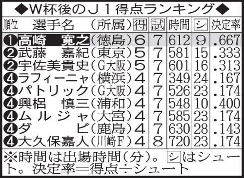 徳島FW高崎寛之(28)が、W杯中断明けから絶好調だ。今季はここまでリーグ8位タイの7ゴールを記録しているが、リーグ再開後に7戦6発と量産。W杯後に限ったJ1得点ランクで、代表入りがうわさされる東京FW武藤、G大阪FW宇佐美(ともに7戦5発)を抑え堂々の首位に立つ。最下位に沈むチームにあって、その決定力は際立っている。