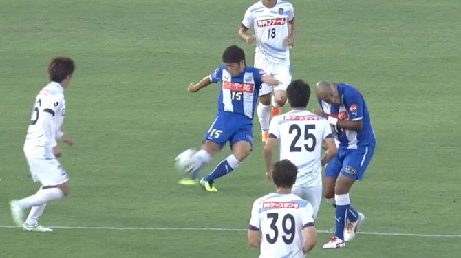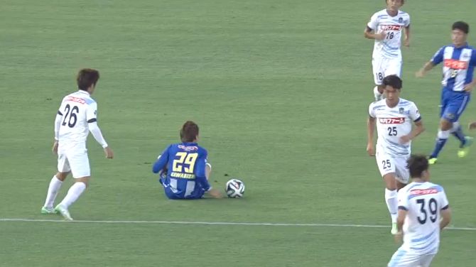 — ♘しょーま♘ (@Shoma1019) 2014, 9月 28前半40分、山形FW川西翔太が倒されて得た自陣でのFKの場面。