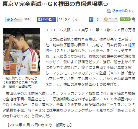 — ane_mone (ane_mone_8) 2014, 10月 27この見出しは酷い 東京V完全消滅…GK権田の負傷退場痛っ http://t.co/iUPYvS3hmn
