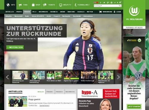 こちらがウォルフスブルク(女子)公式のトップページ。2012-2013シーズンのブンデスリーガ得点王の加入を「後半戦への補強」と大きく報じています。