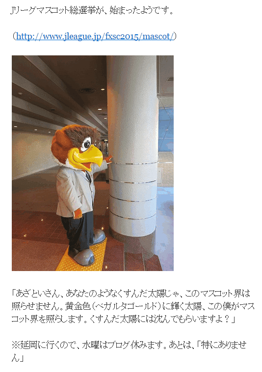 そんな中、第1回のマスコット総選挙で1位に輝くも昨年はヴィヴィくん(とサンチェ)に敗れ3位に転落したベガッ太さんが、公式ブログで今年のセンター奪回を宣言していました。
