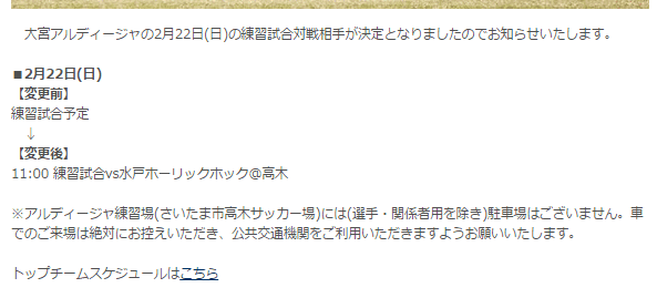 [大宮公式]練習試合決定のお知らせ【2月22日】