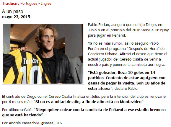 一方で、ウルグアイのサッカーニュースサイトによると、フォルランの父・パブロは「2016年から(ウルグアイリーグの)ペニャロールでプレーする」「セレッソは半年間の延長を希望している」と語ったそうです。