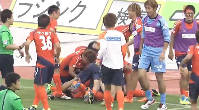 — hisa (naka_hisa) 2015, 6月 14愛媛FCのラストワンプレーでの逆転ゴール。展開も実況の絶叫も凄いが、一番は偶然カメラがとらえた一平君の躍動感www もう本当に普通のサポやんwwww