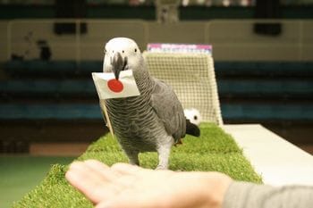 那須どうぶつ王国では、運勢占いとして大活躍のヨウムのオリビアが女子サッカー世界大会の決勝トーナメント 日本戦の勝敗占いをお客様の前で行います。