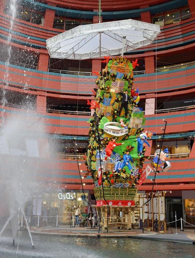 商業施設「キャナルシティ博多」では今年初めて、サッカーJ2のアビスパ福岡を題材にした高さ12メートルの飾り山が登場。施設を運営する福岡地所は創設20周年を迎えたチームのオフィシャルスポンサーで、J1昇格を願って井原正巳監督と選手3人の人形などを飾り付けた。アビスパ福岡の川森敬史社長は「勇壮な飾りに驚いた。上昇気流に乗れるよう頑張りたい」。