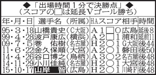 途中出場だった山岸選手は、出場わずか1分でゴールを挙げたのですが、このゴールについて日刊スポーツが興味深いデータを紹介していました。