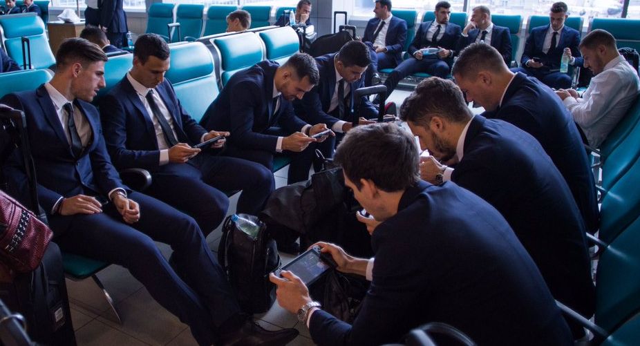 この写真はFIFAコンフェデレーションズカップのためソチに移動中の彼らで、モスクワの空港で乗り継ぎ便を待っている間を利用してゲームを楽しんでいる様子です。