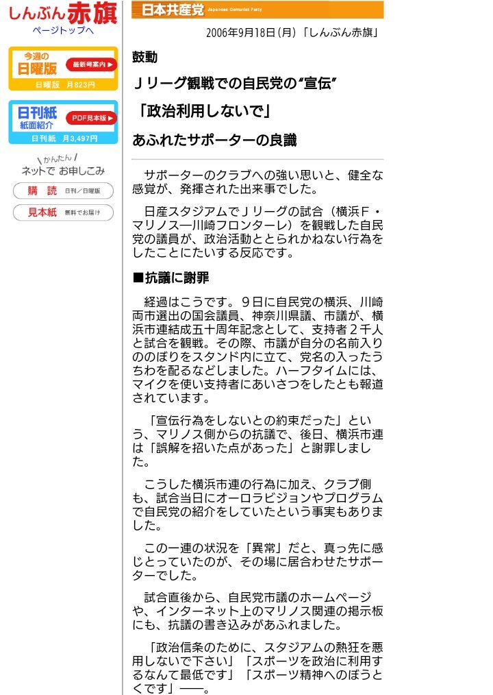 とはいえ、スポーツの世界に政治を持ち込むことは広く知られたタブーであり、特に政治家自身がこのJリーグの精神を踏みにじるのはいかがなものかと思います。