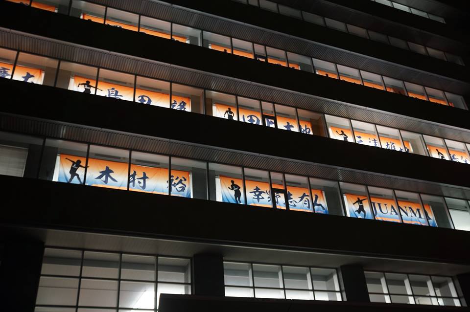 窓面に掲出された選手名の横断幕、夜になると庁舎内の灯りに照らされてこんな光景に。