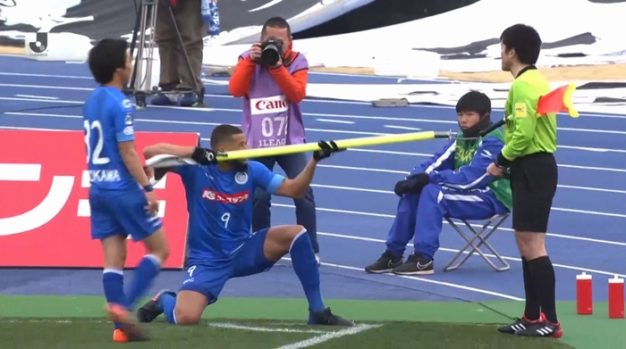 3点目入った後のパフォーマンスでコーナーフラッグ引き抜いてバクスタのサポを狙いうってました