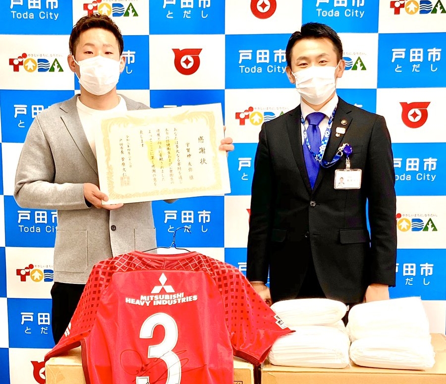 [戸田市公式][記者発表資料]浦和レッドダイヤモンズ宇賀神友弥選手が戸田市にマスク20,000枚寄附