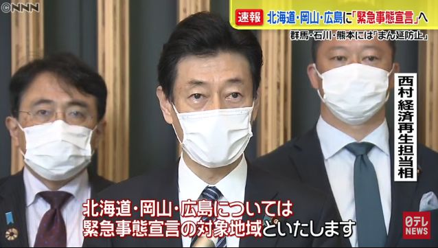 緊急事態宣言に北海道・岡山・広島の3道県を追加へ 群馬、石川、熊本の3県はまん延防止等重点措置の対象に