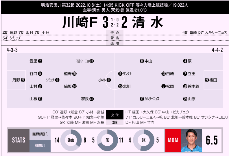 逆転優勝に向け、勝点3が絶対に必要なホームの川崎F。序盤から主導権を握り、清水を守備に回させると、1-0というスコア以上に圧倒して折り返す。ところが、後半に入ると、ギアを上げたアウェイチームの圧力に屈し、立て続けに失点。ため息に包まれた等々力であったが、ここからホームチームが執念を見せる。後半31分に同点に追い付くと、直後に川崎Fの代名詞ともいえる鮮やかな崩しから小林が逆転ゴールを奪う。その後は危なげなく試合をクローズし、タイムアップ。横浜FMが敗れたため、両者の勝点差は「5」に縮まった。