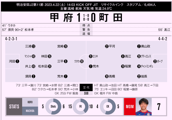 — じゃがお《ひな誕祭一日目参戦》 (so32_AyaCheri) 2023, 4月 22#vfk 甲府1-0町田、試合終了です。首位に勝利。得点はウタカ選手。お疲れ様でした。 https://t.co/9ArlzVwjtu