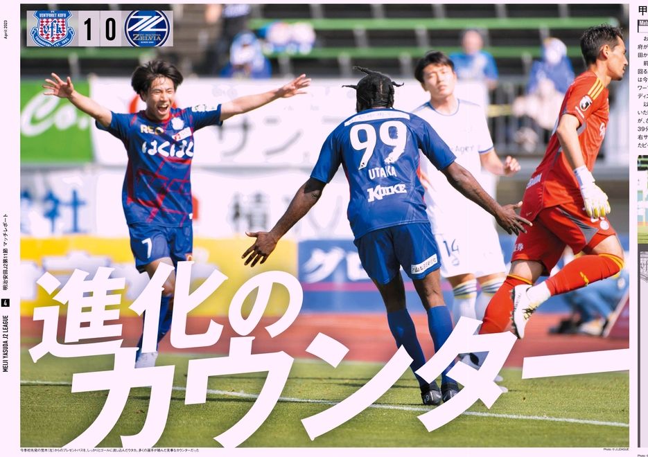 ホームで連勝を飾りたい甲府は前半、細かいパスワークからサイド攻撃を展開してチャンスを創出する。前半41分には華麗な連係で相手を崩し、ピーターウタカのゴールで先制に成功。1点をリードして試合を折り返す。後半はサポーターの声援に応えて追加点を奪いに行くも、町田の攻勢が強まって試合は一進一退の展開に。それでも、安定した守備で1点を守り抜き、1-0で試合終了。攻撃力のある首位チームに対し、2試合連続の「クリーンシート」を達成した。一方の町田は天王山に勝利した勢いを生かせず、連勝を逃してしまった。