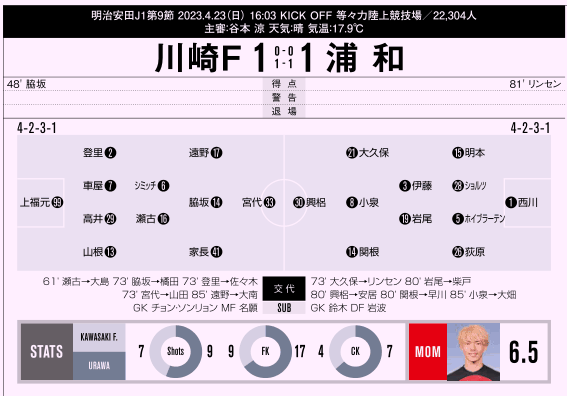 フロンターレ、引き分け。脇坂のゴールで先制も、追い付かれる。次からは、しっかり勝っていこう。 #Jリーグ2023 #川崎フロンターレ #浦和レッズ