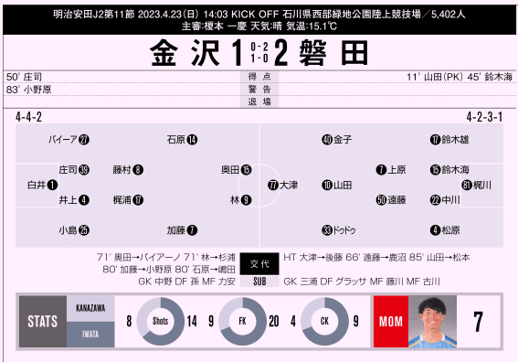3連勝を狙うホームの金沢だが、遠藤を中心とした磐田のコンパクトで強度の高い攻撃に苦戦し、前半11分にPKから先制を許す。さらに、前半終盤にも失点を喫してしまい、劣勢のまま後半へ。それでも、後半序盤にCKから庄司が頭で合わせて1点を返すと、徐々にペースをつかんでいく。白井が幾度もファインセーブを見せて3点目は許さず、攻撃陣も藤村を中心に猛攻を仕掛けるなど、得点が奪えない時間が続く中でも気持ちのこもったプレーを見せた。しかし、最終的に追い付くことはできず、白熱した試合は磐田に軍配が上がった。