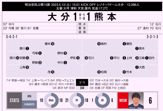 — 青馬ユミ(せいま ゆみ) (Sayma76) 2023, 5月 13明治安田生命J2リーグ 第15節 大分トリニータvsロアッソ熊本戦。 1-1のドローながら良い試合でした。 #J2 #レゾナックドーム大分 #ロアッソ熊本 https://t.co/JNDU55BejE
