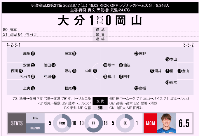 序盤は落ち着かない展開が続く。試合が進むにつれて大分がボールを保持するものの、相手の連動したプレスに苦しみ、思うように前線へ持ち運べない。前半27分には藤本がゴールネットを揺らすが、味方のオフサイドでノーゴールとなり、均衡は破れずに試合を折り返す。後半も同様にもどかしい展開が続くが、途中出場の選手たちが躍動すると、後半35分にその中の1人である渡邉が起点となり、先制に成功。その後は岡山の攻撃をしっかり守り切り、ホームで勝点3を手に入れた。