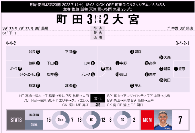 【J2第23節 町田×大宮】町田がエリキ2発と藤尾決勝ゴールで逆転し3試合ぶり勝利!大宮は2点先行も“危険なスコア”に屈す