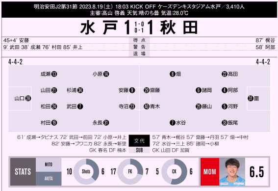 — チータラオ (chee1415tarao) 2023, 8月 19水戸1-1秋田。