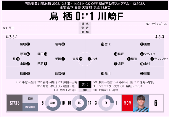 試合は序盤から互いに守備意識の高さが際立ち、堅い展開に。両チームともに思うような攻撃を仕掛けられず、スコアレスでハーフタイムを迎えるが、後半は立ち上がりから鳥栖が攻勢を強めてゴールに迫る。しかし、得点を奪えずにいると、試合の流れは徐々に川崎Fへ。ホームチームは「守護神」朴一圭を中心に再三のピンチをしのいでいたものの、後半42分にCKからオウンゴールで先制点を献上。試合はこのまま終了し、今季最終戦を白星で飾れなかった。一方の川崎Fは、来週の天皇杯決勝に向けて弾みを付ける勝利となった。