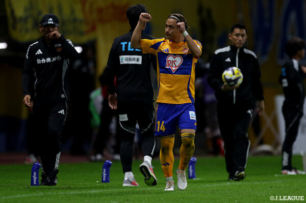 開始直後から熱量の高いプレーが繰り広げられる「みちのくダービー」。仙台はうまく相手の間でボールを受ける郷家と、左から鋭いドリブルを仕掛ける相良の両サイドMFを中心に攻め込み、ペースを握る。先制点を許して迎えたハーフタイムには、さらに攻勢に出るべく、監督は交代カードを切る。すると、これがすぐさま結果に結び付く。特に武田は中央からの崩しに彩りを加え、逆転ゴールを演出する。以降は危なげなく試合を進め、追加点を奪って試合終了。ダービーでのシーズンダブルと、終盤戦という2つの意味で大きな勝点3を獲得した。